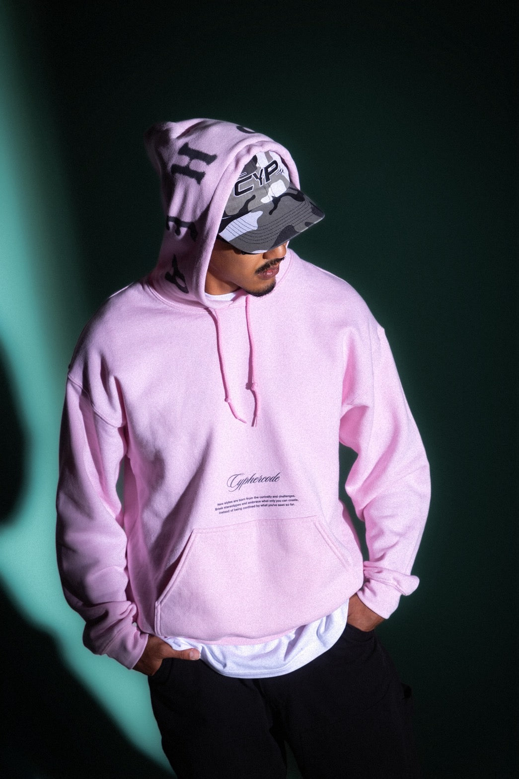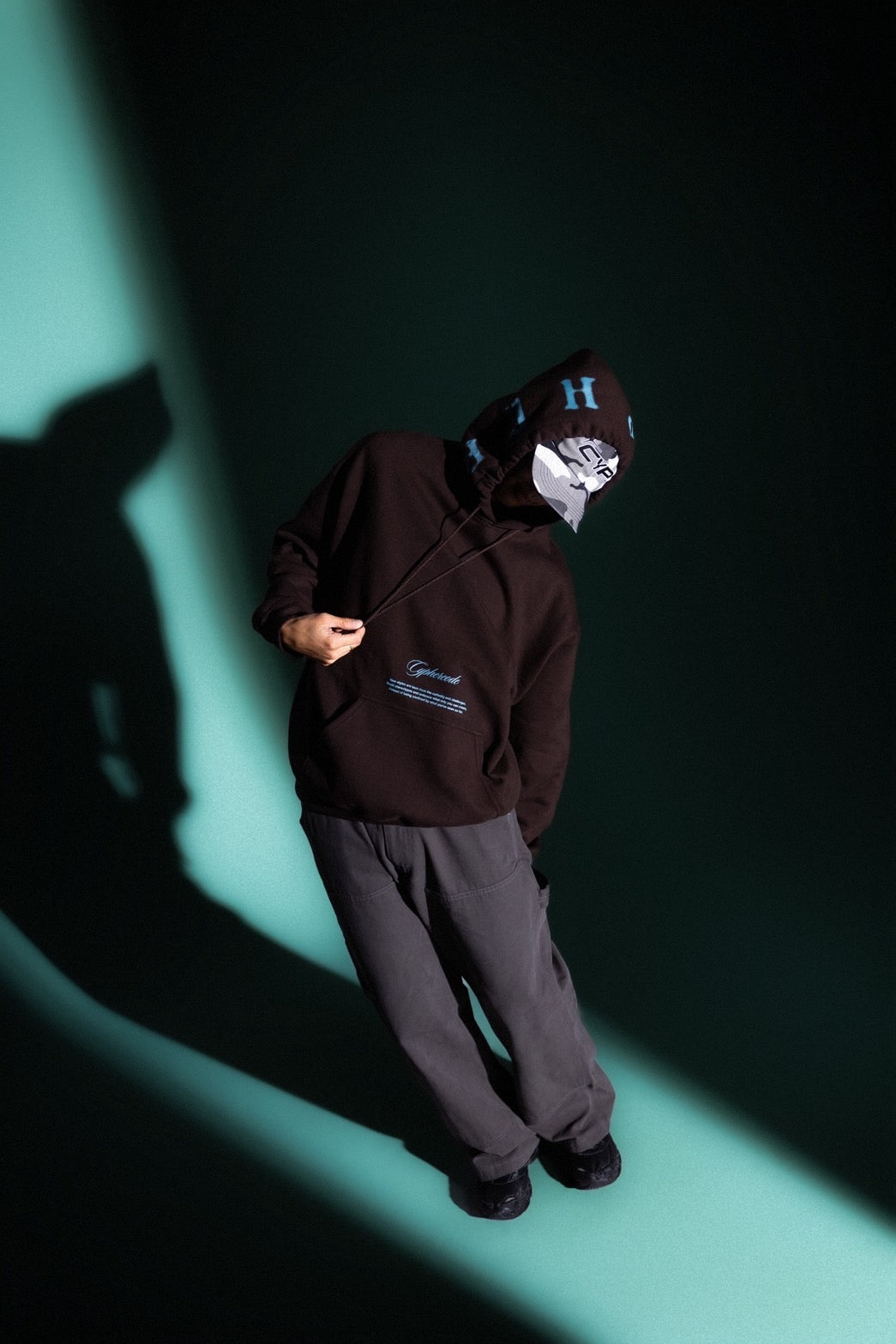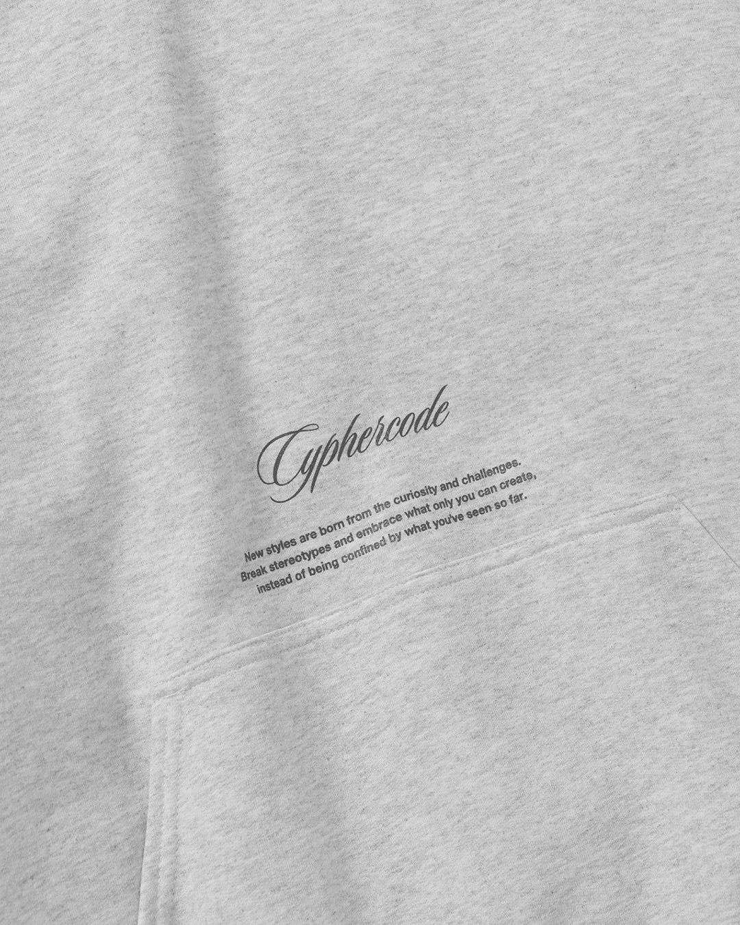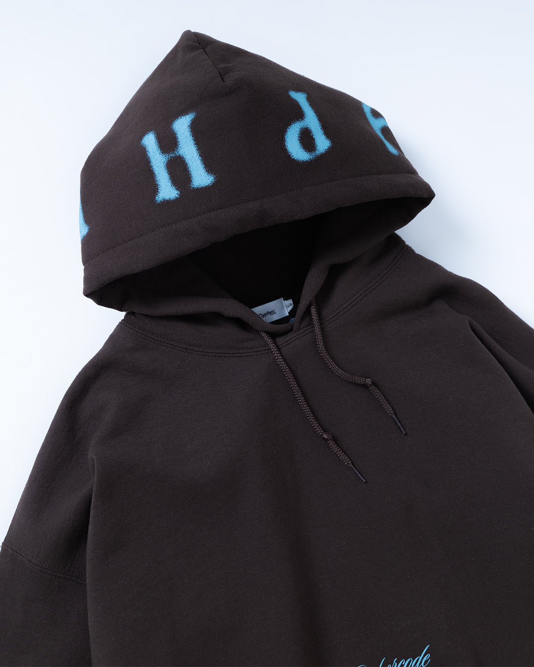 “CYPHER”のレタリングを大胆にフードに跨って配置した、インパクトのあるフーディ。