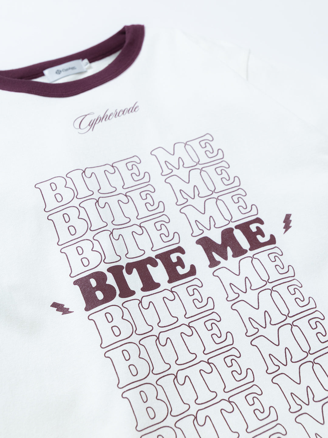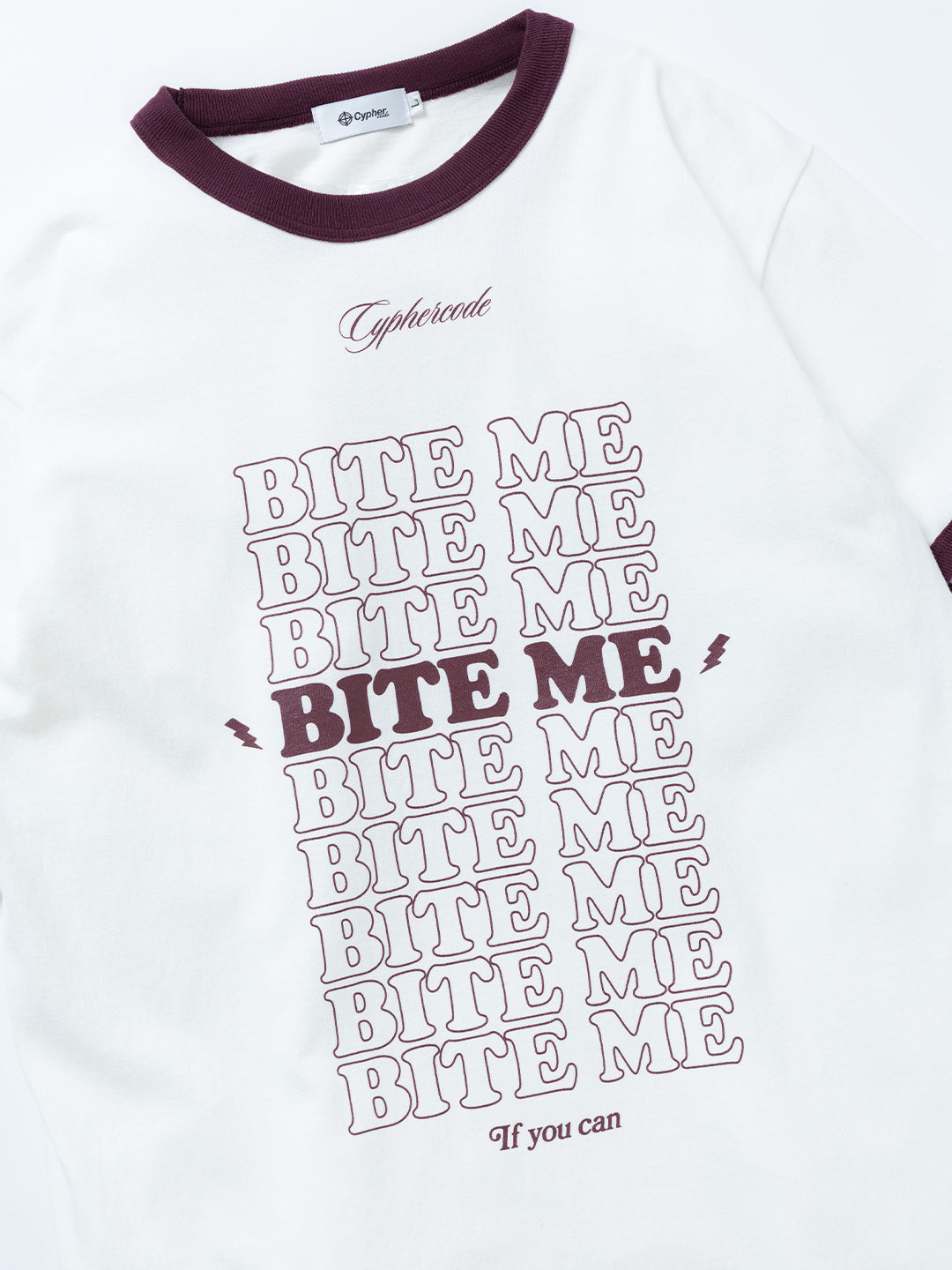 Cyphercodeの定番アイテムであるリンガーTeeに、“BITE ME IF YOU CAN” のテキストをシルクスクリーンで大胆にプリント。